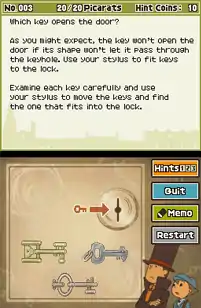 The puzzle menus for this game are very similar to those in Curious Village. Puzzles include brain teasers, sliding puzzles, logic puzzles and others. The player is presented with each puzzle and its value in "picarats", and is given unlimited time to solve it. Each puzzle has three hints available for it, but the player must spend one "hint coin" to see each hint. Hint coins are limited; the player starts with ten, and more can be found by searching the game's locales. Once the player feels he has the answer, he enters it, either by selecting an answer, drawing a circle around a specific part, or entering the answer through character recognition on the Nintendo DS's touchscreen. If the player is correct, the picarats are added to his total score, and he is sometimes rewarded with an item. If the player is incorrect, they can retry the puzzle indefinitely, though the first two times they are wrong, the value of the puzzle will decrease by approximately ten percent each time. Optionally, a player can quit a puzzle at no cost and try another, though certain puzzles are mandatory to progress. Once a puzzle is completed, the player may retry it at any time via the game's menus.