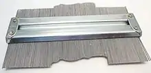 A profile gauge or contour gauge is a tool for recording the cross-sectional shape of a surface. Contour gauges consist of a set of steel or plastic pins that are set tightly against one another in a frame which keeps them in the same plane and parallel while allowing them to move independently, perpendicularly to the frame. When pressed against an object, the pins conform to the object. The gauge can then be used to draw the profile or to copy it on to another surface.