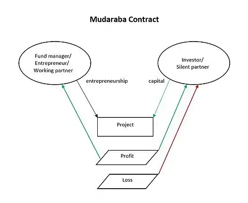 Mudarabah is a partnership where one party provides the capital while the other provides labor and both share in the profits.[12] [13] The party providing the capital is called the rabb-ul-mal ("silent partner", "financier"), and the party providing labor is called the mudarib ("working partner"). In classical mudaraba, the financier provides 100% of the capital; cases where the capital is provided by both the financier and the working partner result in a joint mudarabah-musharakah contract.[9] Profits generated are shared between the parties according to a pre-agreed ratio. If there is a loss, rabb-ul-mal will lose his capital, and the mudarib party will lose the time and effort invested in the project. The profit is usually shared 50%-50% or 60%-40% for rabb ul mal-mudarib.