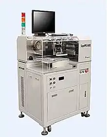 - Automated programmers (multi-programming sites, having a set of sockets)[16] for mass production.[4] These systems utilize robotic pick and place handlers with on-board sites. This allows for high volume and complex output (such as laser marking, 3D inspection, Tape input/output, etc.)