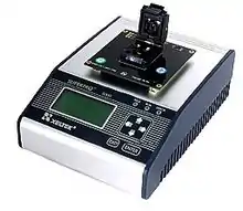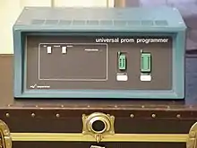 A programmer, device programmer, chip programmer, device burner,[1]: 364 or PROM writer[2] is a piece of electronic equipment that arranges written software to configure programmable non-volatile integrated circuits, called programmable devices.[3]: 3 The target devices include PROM, EPROM, EEPROM, Flash memory, eMMC, MRAM, FeRAM, NVRAM, PLDs, PLAs, PALs, GALs, CPLDs, FPGAs, and microcontrollers.