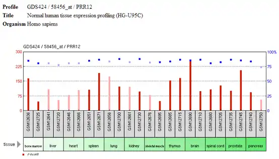 | External IDs | OMIM: 616633 MGI: 2679002 HomoloGene: 18957 GeneCards: PRR12 | ||||||||||||||||||||||||