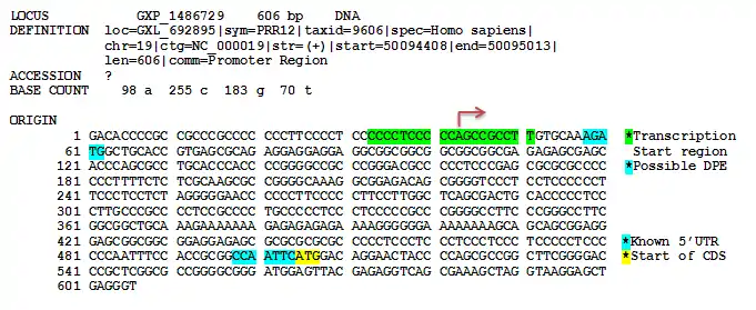The promoter region of PRR12 was predicted using ElDorado at Genomatix.[12] The region starts at position 50094408 and ends at 50095013 of chromosome 19. This promoter set is conserved in the macaque, mouse, rat, horse, cow, pig, dog and zebrafish. No recognizable TATA box, B recognition element (BRE), or CAAT box was found upstream of the predicted transcription start region. Because no clear TATA box was found, it is possible that PRR12 is regulated by a TATA-less promoter containing a downstream promoter element (DPE). However, the predicted DPE is only 15bp downstream of the transcription start region instead of the typical +25 to +32 base pairs. More research will be required to expand the 5’ UTR of the PRR12 transcript in order to confirm where the correct promoter region is located.