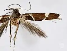 The wingspan is about 9 mm. The forewings are ochreous brown, sporadically with black scales. The markings are white sparsely edged with black scales. The hindwings and cilia are greyish brown.[1]