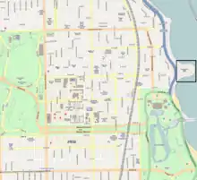 Located on Chicago Park District land at 55th Street in Chicago's south side Hyde Park neighborhood, it was opened to the public in 1937. Alfred Caldwell, a disciple of Jens Jensen,[1] designed the landscaping, following the Prairie School which uses native plants and stone. Caldwell's design featured a raised "meadow" section in the center of the 12-acre (49,000 m2) peninsula and included hundreds of flowering trees and shrubs. In 1938, Caldwell created stone sitting rings - called "council rings" - around the lakefront edge, which today are used as fire pits. Few of Caldwell's original plantings remain today.