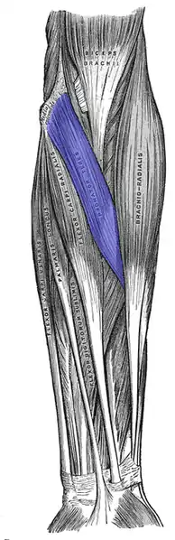 The muscle passes obliquely across the forearm, and ends in a flat tendon, which is inserted into a rough impression at the middle of the lateral surface of the body of the radius, just distal to the insertion of the supinator.