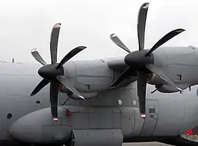 There have been efforts to develop propellers and propfans for aircraft at high subsonic speeds.[30] The 'fix' is similar to that of transonic wing design. Thin blade sections are used and the blades are swept back in a scimitar shape (scimitar propeller) in a manner similar to wing sweepback, so as to delay the onset of shockwaves as the blade tips approach the speed of sound. The maximum relative velocity is kept as low as possible by careful control of pitch to allow the blades to have large helix angles. A large number of blades are used to reduce work per blade and so circulation strength. Contra-rotating propellers are used. The propellers designed are more efficient than turbo-fans and their cruising speed (Mach 0.7–0.85) is suitable for airliners, but the noise generated is tremendous (see the Antonov An-70 and Tupolev Tu-95 for examples of such a design).