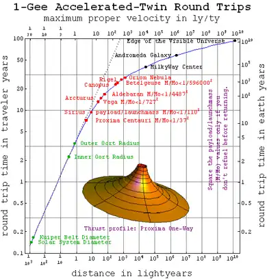 This imagined spaceship could offer round trips to Proxima Centauri lasting about 7.1 traveler years (~12 years on Earth clocks), round trips to the Milky Way's central black hole of about 40 years (~54,000 years elapsed on earth clocks), and round trips to Andromeda Galaxy lasting around 57 years (over 5 million years on Earth clocks). Unfortunately, sustaining 1-gee acceleration for years is easier said than done, as illustrated by the maximum payload to launch mass ratios shown in the figure at right.