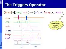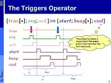 The most commonly used PSL operator is the "suffix-implication" operator (a.k.a. the "triggers" operator), which is denoted by |=>. Its left operand is a PSL regular expression and its right operand is any PSL formula (be it in LTL style or regular expression style). The semantics of r |=>p is that on every time point i such that the sequence of time points up to i constitute a match to the regular expression r, the path from i+1 should satisfy the property p. This is exemplified in the figures on the right.