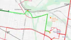 In April 2018, the State Government of Victoria announced a new extension of the tram network from Caulfield.[1] The 18 km (11.1 mi) extension would run from Caulfield station to Chadstone, Monash University, Waverley Park and Rowville.[2] The state government allocated $3 million to plan the route, which would be constructed in two stages, with the first running from Caulfield to Monash.[2][3] This proposal is a light rail alternative to the long-proposed Rowville railway line project. In the 2018-2019 Federal Budget, the Australian Government committed $475 million to a heavy rail line from Caulfield to Monash University that would run on the same corridor as the light rail proposal.[4][5] In 2019, nearby local councils expressed concern that the project had been shelved.[6] In 2021, Monash University began lobbying the state and federal governments for an alternative rapid bus plan, using experimental "trackless tram" technology.[7][8]
