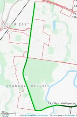 In the lead up to the 2014 State election, the Greens proposed extending Route 57 for 5.5 km from its current terminus in Maribyrnong along Canning Street and Milleara Road before reaching a new terminus at the Keilor East shopping precinct.[33] In 2018, the Rail Futures Institute called for a similar extension of the route to Lower Avondale Heights.[17]
