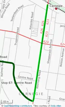The PTUA and the Rail Futures Institute have both proposed a continuation of Route 67 from its current terminus north up Koornang Road, terminating at Carnegie railway station and passing through Carnegie shopping strip.[17][18] It would cover just 900 metres and become a modal interchange.