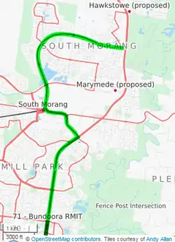 The City of Whittlesea's 2016 Future Transport Plan called for an extension to the Route 86 tram as a 'very high' priority.[35] The council proposed an extension of the route from its current terminus at University Hill near Bundoora's RMIT Campus to the Plenty Valley Town Centre in South Morang. This proposal included a stop at South Morang station. Other local plans have included going to Hawkstowe station and even as far as Doreen via Mernda.[36]