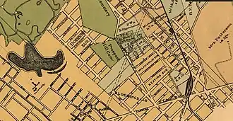 In 1858, the German Evangelical Church Society decided to purchase a cemetery for Concordia Church.[10][11] The society bought a site, but then discovered that the title to it was not clear.[12] A second site was then sought. Seventeen acres of Moore's Farm, located in the Glenwood neighborhood (now known as Edgewood), were purchased for $7,000 ($219,235 in 2021 dollars) on September 23, 1858.[11][8][13] Title in the land was invested in two members of the German Evangelical Church Society, although the deed of transfer specified that the title should be transferred to an appropriate corporate organization once a charter was obtained from Congress (which, at that time, chartered corporations in the District of Columbia).[10][lower-alpha 2][14] The whites-only cemetery was dedicated on September 26, 1858, with a parade featuring a band and three German membership associations.[8] Reverend Finkle, who led the ceremonies and blessed the grounds, declared the cemetery open to all classes and members of any religious sect.[8]