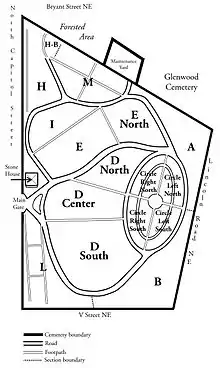 Prospect Hill was designed as a garden cemetery (also known as a rural cemetery). Until the early 1800s, most burying grounds (the word "cemetery" did not come into use in the United States until the 1840s)[16] were next to churches. They were very overcrowded and unhealthy, with graves stacked upon each other or emptied and reused for new burials.[17] As a reaction to the urban cemetery, the first "garden" cemetery—Père Lachaise Cemetery in Paris—opened in 1804.[18] The concept quickly spread across Europe.[19] Garden/rural cemeteries did not have to be outside the city limits. When land within a city could be found, the cemetery was enclosed with a wall to give it a garden-like quality. These cemeteries were often not sectarian, nor co-located with a house of worship. Inspired by the English landscape garden movement,[20] they often looked like attractive parks. The first garden/rural cemetery in the United States was Mount Auburn Cemetery near Boston, Massachusetts, founded by the Massachusetts Horticultural Society in 1831.[21] It was followed by Laurel Hill Cemetery in Philadelphia in 1836, and Green-Wood Cemetery in Brooklyn in 1838.[22] Prospect Hill was designed as a typical garden cemetery, with winding roads and paths, a high stone wall, and (in time) many trees and bushes.[15][23] Its main entrance was on Lincoln Road. The cemetery's most prominent feature was an ellipse, bounded on the outer edge by a road and featuring two paths: one an inner, oval path paralleling the road and the other a straight, cruciform path. The ellipse was aligned with Lincoln Road, and most burials here faced east.[24] The District of Columbia Preservation Review Board has described the layout of the cemetery as "characteristic and a relatively early example of the garden cemeteries created in the United States beginning in the 1830s".[25] According to the Historic American Landscapes Survey, Prospect Hill Cemetery, along with Glenwood Cemetery (1854) and Mount Olivet Cemetery (1858), "changed the dynamics of cemeteries in the city" by setting a new standard for cemetery design and layout.[23]