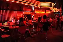 One observer says that, "So-called 'karaoke bars' commonly feature karaoke machines as décor, even though few or no customers visit such venues to sing, but rather to buy sex service."[27] In a 2015 study by the Ubon Ratchathani Provincial Health Service, there were 2,410 women working in restaurants and karaoke bars in Ubon Ratchathani Province. Of these, 1,230 were confirmed sex workers. Just over half of them—692 women—were from Laos working illegally in Thailand.[6]