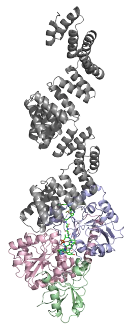 The human OGT gene has 1046 amino acid residues, and is a heterotrimer consisting of two 110 kDa subunits and one 78 kDa subunit.[10] The 110 kDa subunit contains 13 tetratricopeptide repeats (TPRs); the 13th repeat is truncated. These subunits are dimerized by TPR repeats 6 and 7. OGT is highly expressed in the pancreas and also expressed in the heart, brain, skeletal muscle, and the placenta. There have been trace amounts found in the lung and the liver.[5] The binding sites have been determined for the 110 kDa subunit. It has 3 binding sites at amino acid residues 849, 852, and 935. The probable active site is at residue 508.[16]