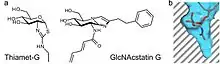 OGA catalyzes O-GlcNAc hydrolysis via an oxazoline reaction intermediate.[17] Stable compounds which mimic the reaction intermediate can act as selective enzyme inhibitors. Thiazoline derivatives of GlcNAc can be used as a reaction intermediate. An example of this includes Thiamet-G as shown on the right. A second form of inhibition can occur from the mimicry of the transition state. The GlcNAcstatin family of inhibitors exploit this mechanism in order to inhibit OGA activity. For both types of inhibitors, OGA can be selected apart from the generic lysosomal hexosaminidases by elongating the C2 substituent in their chemical structure. This takes advantage of a deep pocket in OGA's active site that allow it to bind analogs of GlcNAc.[18]