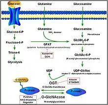 Over 600 proteins are targets for O-GlcNAcylation. While the functional effects of O-GlcNAc modification is not fully known, it is known that O-GlcNAc modification impacts many cellular activities such as lipid/carbohydrate metabolism and hexosamine biosynthesis. Modified proteins may modulate various downstream signaling pathways by influencing transcription and proteomic activities.[16]