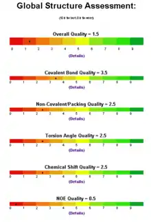 Structure validation is a particularly important component of the structure determination pipeline as many protein structures have small structural errors (i.e. distorted bond lengths or angles, incompatible torsion angles, overlapping atoms) that are not easily detected by visual inspection. For protein structures solved by NMR spectroscopy, where large numbers of structures are generated and where coordinate inaccuracies are common, this problem is particularly acute.