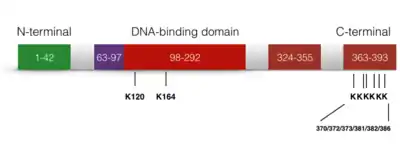 The acetylation of p53 is indispensable for its activation. It has been reported that the acetylation level of p53 will increase significantly when the cell undergoes stress. Acetylation sites have been observed on the DNA binding domain (K164 and K120) and the C terminus.[40] Acetylation sites demonstrate significant redundancy: if only one acetylation site is inactivated by mutation to arginine, the expression of p21 is still observed. However, if multiple acetylation sites are blocked, the expression of p21 and the suppression of cell growth caused by p53 is completely lost. In addition, the acetylation of p53 prevents its binding to the repressor Mdm2 on DNA.[41] In addition, it is suggested that the p53 acetylation is crucial for its transcription-independent proapoptotic functions.[42] An acetylation site of the C-terminus was investigated by molecular dynamics simulations and circular dichroism spectroscopy, and it was suggested that the acetylation changes the structural ensemble of the C-terminus.[43]