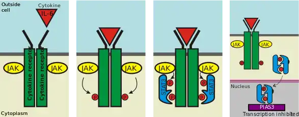Additionally, PIAS proteins are important transcriptional co-regulators of the JAK/STAT signaling pathway. PIAS protein's interaction with STAT signaling requires tyrosine phosphorylation of STAT proteins.[21] Additionally, PIAS1 binds preferentially to un-methylated STAT1.[21] Although the exact mechanism isn't clear, PIAS1 and PIASy both inhibit STAT1 signaling.[2][22] PIAS3 was found to specifically inhibit STAT3 signaling after stimulation by the cytokine IL-6.[1] Also, it is known that PIAS1 can inhibit NF-κB activity upon stimulation by the cytokine TNF and the LPS endotoxin.[15]