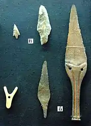 Although Proto-Indo-Europeans have been often cast as warlike conquerors, their reconstructed arsenal is not particularly extensive.[97][98] There is no doubt that they possessed archery, as several words with the meaning of "spear" (*gʷéru ; *ḱúh₁los), "pointed stick" (*h₂eiḱsmo) or "throwing spear" (*ǵʰai-só-s) are attested.[99] The term *wēben meant a "cutting weapon", probably a knife, and *h₂/₃n̩sis a "large offensive knife", lilkely similar to bronze daggers found across Eurasia around 3300–3000 BCE. Proto-Indo-Europeans certainly did not know swords, which appeared later around 2000–1500.[100][97][101] The axe was known as *h₄edʰés, while the word *spelo/eh₂ designated a wooden or leather shield.[97] The term *leh₂wós meant "military unit" or "military action",[102][103] while *teutéh₂- might have referred to the "adult male with possession" who would mobilize during warfare, perhaps originally a Proto-Indo-European term meaning "the people under arms".[47][103]