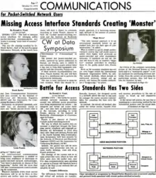A protocol for internetworking was also being pursued by the International Networking Working Group, consisting of ARPANET researchers, members of the French CYCLADES project and the British team working on the NPL network and European Informatics Network.[24][25] They agreed an end-to-end protocol that was presented to the CCITT in 1975 but was not adopted by the CCITT or by the ARPANET.[26] The fourth biennial Data Communications Symposium that year included talks from Donald Davies, Louis Pouzin, Derek Barber, and Ira Cotten about the current state of packet-switched networking.[nb 2] The conference was covered by Computerworld magazine which ran a story on the "battle for access standards" between datagrams and virtual circuits, as well as a piece describing the "lack of standard access interfaces for emerging public packet-switched communication networks is creating 'some kind of monster' for users". At the conference, Louis Pouzin said pressure from European PTTs forced the Canadian DATAPAC network to change from a datagram to virtual circuit approach.[13]