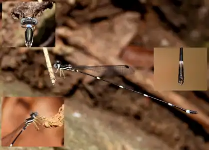 It is a large slender damselfly with black capped ultramarine blue eyes. Its prothorax is blue with posterior lobe black. Its thorax is glossy black, marked with two narrow blue lateral stripes on each side. There is a similar stripe on the posterior part of metepimeron. Abdomen is black, marked with white and blue. Sides of segment 1 is blue; 2 is white. Segment 3 is with a narrow basal annule. Segments 4 to 7 are with broad basal annules. Segment 8 is with its basal half turquoise-blue, extending along sides nearly as far as apex, and separated from the base of segment by a very narrow black basal ring. Segments 9 and 10 are unmarked. Anal appendages are black. Female is very similar to the male, but shorter and more robustly built.[2]