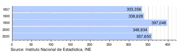 The province has an area of 14,300 km2 (5,500 sq mi) and a population of approximately 375,000 of whom nearly half live in the capital. The other locations higher than 20,000 inhabitants apart from Burgos are Miranda de Ebro and Aranda de Duero, both very industrialized. The Sierra de la Demanda, the northwesternmost end of the Sistema Ibérico, is located in Burgos Province.[3]