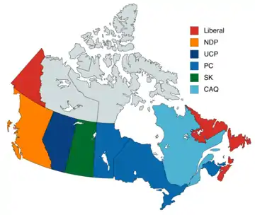 The governing political party(s) in each Canadian province. Multicoloured provinces are governed by a coalition or minority government consisting of more than one party.