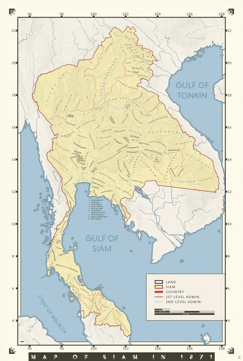 Map of Siam in 1871 showing provinces.