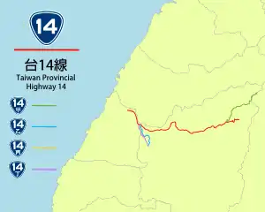 Provincial Highway 14 is an east–west highway that connects Changhua City in Changhua County with Ren'ai, an aboriginal township in Nantou County. The highway is known as Zhongtan Highway (中潭公路) from Caotun to Puli, and Puwu Highway from Puli to Ren'ai. The total length is 99.0 kilometers.[1]