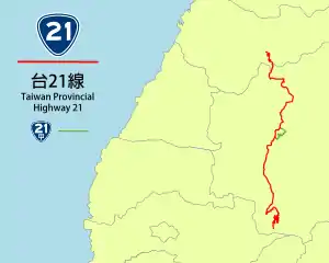 Taiwan Provincial Highway No. 21 is a Provincial Highway in Taiwan that begins Tianleng (天冷), Dongshi District, Taichung City, at the intersection with Provincial Highway No. 8 (Central Cross-Island Highway), and ends at Tataka(塔塔加), where it is connected with Provincial Highway No. 18 (New Central-Crossing Highway) in Yushan National Park. It is the primary highway to the Sun Moon Lake, a popular tourist destination. The total length is 145 km.[1]