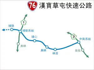 Provincial Highway 76 (Chinese: 台76線) is an expressway, which begins in the border of Puyan, Changhua and Fuxing, Changhua on Jhangshuei Road (Provincial Highway 19) and ends in Caotun, Nantou on (National Highway No. 3).