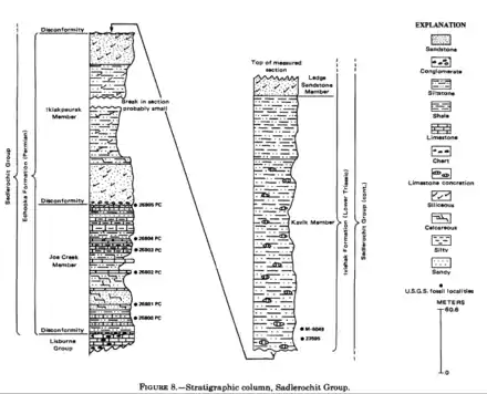 In 1968, Prudhoe Bay State No. 1 encountered the Permian-Triassic Sadlerochit formation at 8200 feet which flowed gas at 1.25 million cubic feet per day with 20–27 per cent porosity and "tens of millidarcies" permeability.[45] Oil, condensate and gas are produced from the Triassic, Ivishak sandstone. This reservoir was deposited as a complex amalgamation of fan deltas and alluvial fans. The continuity of this fan delta was shown to extend seven miles away when the ARCO-Humble Sag River State No. 1 well was drilled.[46] During the field's early life the oil-bearing sandstone in some locations was 600 feet (180 m) thick. Today, the oil bearing zone's average thickness is about 60 feet (18 m) and the initial estimate of Oil in place was 2.3 billion barrels.[47][48]