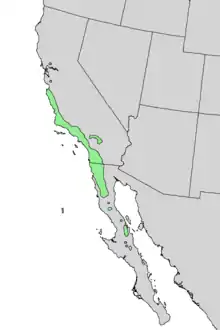| Natural range of Prunus ilicifolia (var. ilicifolia green; var. occidentalis blue) | |