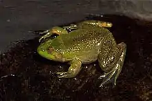 Males measure 22–46 mm (0.9–1.8 in) and females 30–57 mm (1.2–2.2 in) in snout–vent length.[2][5] The body is robust. The head is broad and the snout is rounded. The tympanum is distinct. The forearms are robust with robust fingers; no webbing is present. The hind limbs are short and robust with extensively webbed toes. The body and the limbs are dorsally light to dark green, olive, or brownish. There are usually some darker spots or blotches of irregular form. A black or dark green stripe runs along the canthus rostralis; it can be narrow or broad and blot-like. The tympanum is olive, tan or light brown. The lateral surfaces of head, body, and thigh are light yellow. Ventral surfaces are white. Males have paired vocal sac.[2]