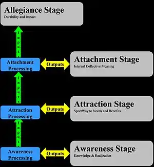 In the attachment stage the benefits and the sport object are internalised taking on a collective emotional, functional, and symbolic meaning.[12] The psychological connection towards a sport, event, team or leisure hobby strengthens. Internal processes become more important and the influence of socializing agents decreases. Examples for the attachment stage are I am a football player or I am an Arsenal Fan.