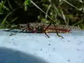 Pteronarcys californica nymphs, or larvae, can grow to lengths in excess of 5 centimetres (2 in). The nymphs' dorsal side (back) is dark in colour, although their ventral side (belly) is lighter. The colouring can vary, and subtle patterns are occasionally found on the abdomen. They are detritivores, eating stream debris partially broken down by other organisms. They are "shredders" as a functional feeding group, breaking down large bits of detritus into smaller while feeding.[2] The adults are also large, and the abdomen, leg joints, and several thorax joints are a bright orange colour. Two pairs of large wings, kept flat against the body when at rest, are longer than the body. The adult carries its eggs at the end of the abdomen and look like a cluster of orange salmon eggs.