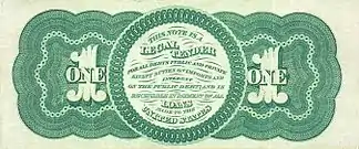 Prior to the Civil War, the U.S. operated on a gold standard in practice. Bank notes were legal tender issued by state banks which could be exchanged for an amount of gold at any bank. Both gold and bank notes circulated as mediums of exchange. On February 25, 1862, the U.S. passed the First Legal Tender Act to help finance the Civil War. The act changed the economy to a fiduciary standard based on a fiat currency called United States Notes, or more popularly, greenbacks. Unlike bank notes, greenbacks were not backed by any metallic standard and functioned as a "loan without interest."[1] Greenbacks were issued as an immediate, short-term relief for the country's growing demand for currency. The issuance of greenbacks and the sale of government bonds to finance the war were led by the Secretary of the Treasury at the time, Salmon P. Chase.[2] Until 1879, gold, bank notes, and greenbacks were used as mediums of exchange and had free floating exchange rates.