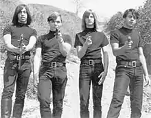 Public Nuisance formed in Sacramento, California in 1964 as an instrumental surf rock band called the Jaguars, but after the advent of the British Invasion and folk rock they adopted the use of vocals and changed their name to Moss & the Rocks.[1][2][3][4][5] Their lineup consisted of David Houston, their principal songwriter, on guitar, keyboards, harmonica, and vocals, Jim Mathews on guitar, Pat Minter on bass and vocals, and Ron McMaster on drums and vocals.[5] Even while known as the Jaguars, the group were known for their stage antics.[2] David Houston would sometimes smash his guitar on stage, and the group wore hairstyles that were considered extremely long for 1964.[5]