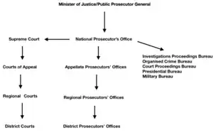 The 1950 Act was replaced by the 1985 Act on the Public Prosecutor’s Office. Significant amendments made after Poland’s transition to democracy removed the prosecution service from the control of the abolished Council of State and combined the role of Public Prosecutor General with the Minister of Justice.[8][9] This amendment aimed to relieve the prosecution of political interference and impropriety given the accountability of the Minister of Justice to the Sejm. It was supposed that parliamentary accountability would foster greater transparency and reduce arbitrariness in prosecutorial judgements. However, in practice the combination of the Minister of Justice with the office of Public Prosecutor General has permitted political control and influence of the prosecution service by the ruling party of the day,[10] with prosecutorial decisions exposed to the exigencies of party politics. Under 2007 amendments to the Act, the Minister of Justice was given power to personally make orders on ongoing cases.[11]