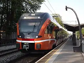 The Elron commuter trains are especially meant for the Greater Tallinn Area Harju County residents for a connection to Tallinn. Routes are also used by city residents, especially of Nõmme district, the southernmost district of Tallinn. Railway lines pass through Kristiine, Nõmme and Lasnamäe districts of the city, with terminus stop Balti jaam (Baltic Station near the Baltic Sea, hence the name) being located in the Kesklinn district close to Põhja-Tallinn district. Railway transport is free for registered city residents inside the city borders (1st zone): till Vesse stop on Eastern line, Laagri stop on Western line and Männiku stop on South-Western line.[18] Trains inside of Tallinn are scheduled typically with 10-20 minute interval at rush hour (6 am - 8:30 am and 3:30 pm – 18:30 pm) and 25 - 35 minute interval at other times. Trains are in service typically from 5:15 am to 23:45, depending on the direction and line. Nõmme district has installed bicycle parking to every railway station in the district to encourage commuter train use by its residents. Currently there are no appropriate feeder bus routes for the commuter train in Nõmme district.[19]
