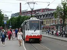 The tram network is fairly short (19.7 km or 12.2 miles) and serves mainly the city centre with its surrounding areas. There are 4 tram lines and three types of trams—Tatra KT4 (bought from the German cities of Gera, Cottbus, Frankfurt, and Erfurt) and Tatra KTNF6, which basically is a Tatra KT4 with a lowered middle-section, and CAF Urbos AXL. Twenty new CAF Urbos AXL trams entered service in 2015/16.[10] Altogether there are 70 trams in Tallinn but only about half of them are in daily use.