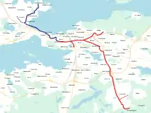 The Tampere commuter rail network currently consists of one line centered around Tampere Central Station. Line M connects Toijala, Viiala, Lempäälä to Tampere, continuing onward to Tesoma and Nokia. Most of the services on the route are segmented on the route Tampere−Nokia; only several services a day use the entire route from Toijala to Nokia.[2][3]