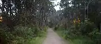 The Main Track starts (from south to north) at the boardwalk beginning at the northern end of the bridge over Fairy Creek, part of Squire's Way and following a route hugging the northwest side of the lagoon for a hundred metres or so. At this section there are several wooden seats and fishing is a not uncommon practice from the boardwalk. From the boardwalk one can see the southern part of the reserve, the lagoon entrance and North Wollongong. From here it crosses the creek at a wooden bridge and turns into a track on the other side. In high tide and flood conditions this small portion may flood. From here it goes left (north), following the east side of the creek through she-oak woodland and other common coastal plants before going towards the coast through coastal banksia and acacia growth. Then it returns to the creek until it reaches the split to two paths heading to Fairy Meadow Beach picnic area. The left hand one goes along the creek and to a bridge that reaches a small island with a picnic area in the creek, the second up a five or so metre high hill and along through coastal bush. Benches for bird watching and enjoying nature may be found along the path at several intervals. The right hand track to the picnic ground has excellent 360 degree views of the plain, sea and the escarpment.