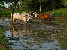 Puddling is the tillage of rice paddies while flooded, an ancient practice that is used to prepare for rice cultivation. Historically, this has been accomplished by dragging a weighted harrow across a flooded paddy field behind a buffalo or ox, and is now accomplished using mechanized approaches, often using a walking tractor.[1]