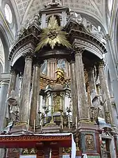 The interior of the cathedral contains many artistic artifacts that are found in its 14 lateral chapels and the main altar. Its principal altar is referred to as "The Major Altar", or "The Altar of the Kings", which was designed by Manuel Tolsa and built between 1797 and 1818. Some bishops of Puebla are buried under it. Across most of the rear wall of the cathedral is a Blessed Sacrament chapel.[1] The inside of the dome of the apse chapel was painted with The Assumption of the Virgin by Cristóbal de Villalpando.[5]