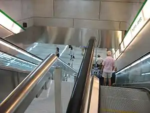 Puerta Jerez (English: Jerez Gate) is a station of the Seville Metro on the line 1.[1] It is also, a tram stop of the MetroCetro line. It is located at the intersection of Paseo de Cristina Av. and Almirante Lobo St., in the district of Casco Antiguo. Puerta Jerez is an underground station, so far, it is the nearest at historic centre of the city. This centric station is located between Plaza de Cuba and Prado de San Sebastián on the same line. It was opened on 16 September 2009.